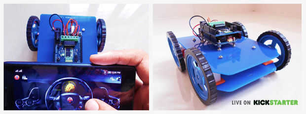 Hicimos un Smartphone controlado Rover Kit para nuestra campaña Kickstarterhttp://kck.st/1R3PIWE le mostraremos cómo hacer uno tú mismo. Los componentes pueden comprarse individualmente o visitan nuestra campaña para el Kit. Si quieres hacer uno usted mismo estamos compartiendo los archivos de diseño aquí. Conectividad Bluetooth con tu smartphone estamos usando Jetpack-un escudo de programación inalámbrica + motor shield para Arduino. Usted puede usar sustitutos de sus propio