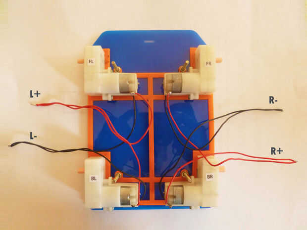 Los motores a la izquierda están conectados en paralelo semejantemente para la derecha, compruebe los cables con una batería para determinar la dirección de la rotación
