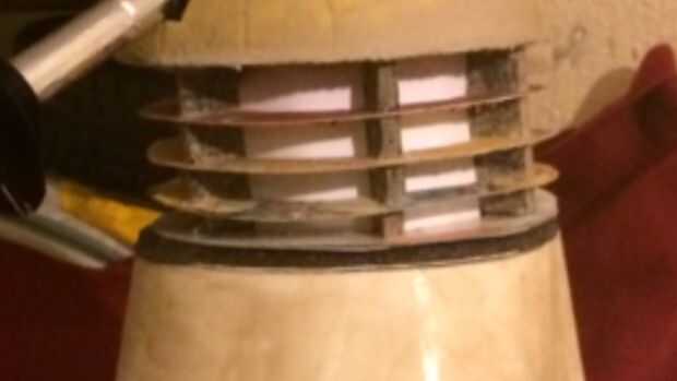 Todos los cables aéreos y de las luces deben ser conectado y funcionando a través del centro de cada panel. Debe tener una buena longitud del eje de centro que dará vuelta la cabeza, empujando a través de la parte superior de la sección del pecho. Debo mencionar aquí que en un Dalek real, la sección se mantiene fija a la sección del pecho y sólo la bóveda real cabeza rota. Fui un poco diferente con este, como no quería que los 4 cables provenientes del tallo de ojos tirando a mucho en la vivienda, y necesito espacio para el sistema de polea para el tallo del ojo.