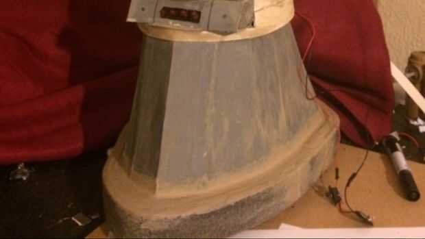7.)el tope base. Con poco más de espuma PVC, recorte unas tiras de unos 4cm de ancho y largo suficiente para rodear toda la base de lo Dalek. No tienen espuma tiempo suficiente para recorrer todo el camino de 1 paz, así que tuve que utilizar 2 longitudes más cortas por capa. Corte suficiente para hacer 3 capas para hacer el parachoques completo. 1 de la capa a la vez, algunos adhesivo gancho agarrador en la longitud del centro de un lado de la espuma de la pipa y se aplican a los lados de la base debajo de los paneles de la falda, suavemente apretando en, asegurando es recto todo el camino alrededor. Tendrás unos minutos para hacerlo antes que el adhesivo empiece a establecer. Lo mismo a las capas 2 y 3 espera alrededor de 1/2 hora entre capas. La espuma es luz suficiente para que no resbale hacia abajo.