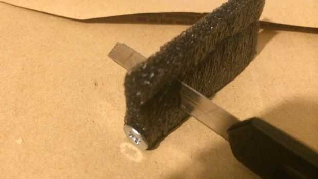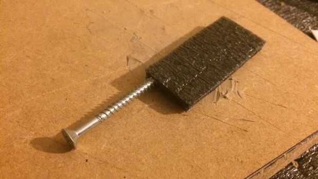 3.) para hacer los soportes, utilizar una paz de PVC espumado y cortar 6 piezas mide 5,5 cm de alto y 3 cm de ancho. En el borde de cada sección, a partir de un extremo, con cuidado, enrosque en uno de los tornillos de 5,5 cm, tratando de mantenerlo lo más recto posible hacer un lomo (ver foto). Atorníllelos en toda la longitud de los soportes de espuma de PVC.