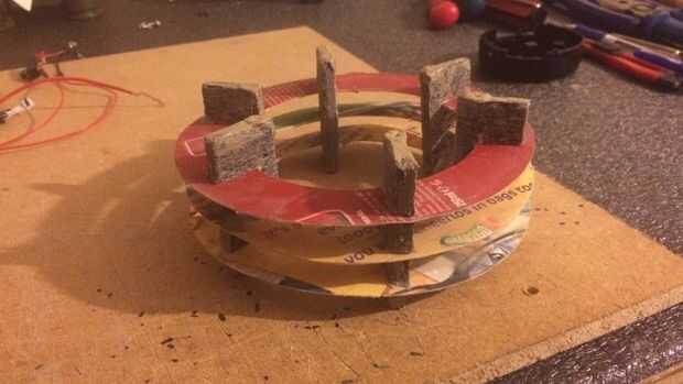 8.) casarse hasta el 5 º disco cartulina cortar y anillo de sección con la bisagra metálica frente a la parte trasera, asegurándose de que tiene un perfecto alrededor de todo el camino y haga una marca pequeña donde la bisagra debe ser fijo. Tener a mano el pegamento estupendo, abrir la bisagra metálica fijada a la sección del anillo a 90 o 180 grados (lo que es más fácil), aplicar pegamento en el disco de cartón y coloque el la placa de la bisagra y espera establecer. Tendrá que esperar a que el pegamento se seque completamente como usted no quiere la bisagra para permanecer juntos.