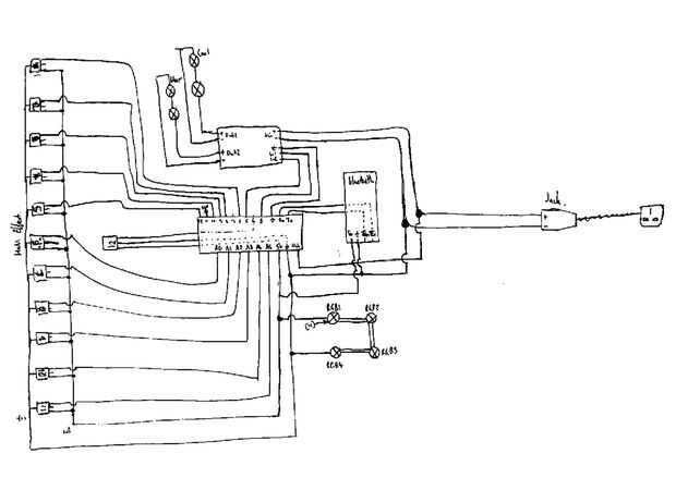 El primer paso de este proyecto era conectar el hardware de la electrónica. Opté por usar un Arduino Micro ya que tiene un buen número de pernos leemos analógicos - que me permita utilizar varios sensores de efecto hall para dar suficiente resolución para la fijación de los ajustes. Una fuente de alimentación 12V DC se reparte entre alimentar al Arduino y LED piloto.