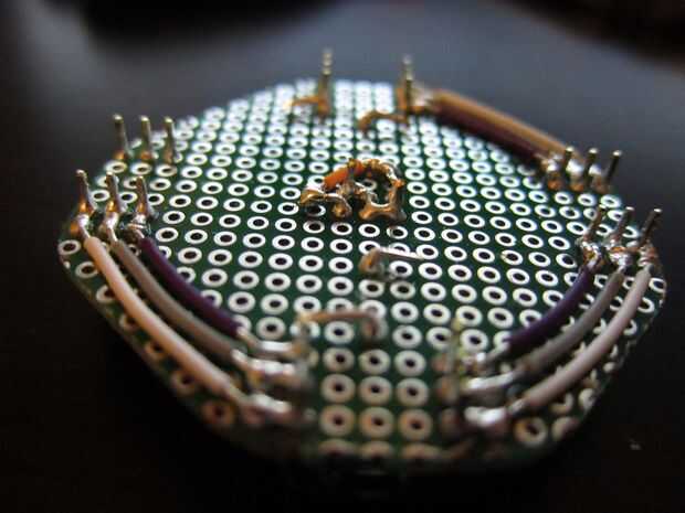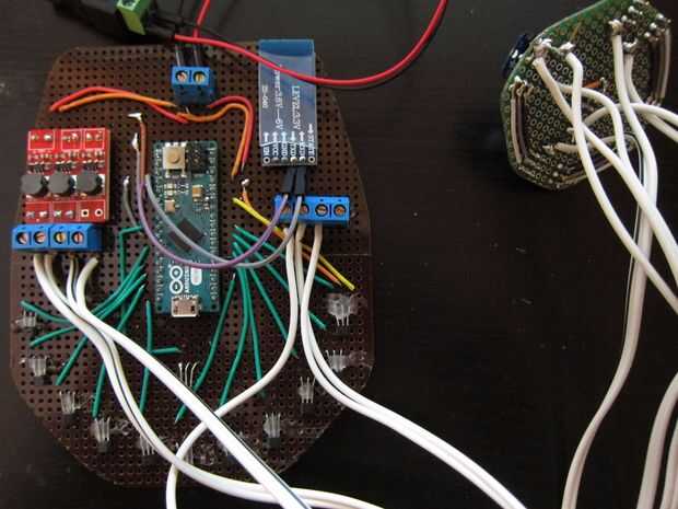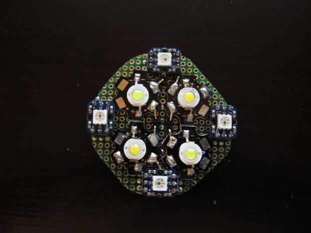 Los LED fueron montados en un tablero separado. Dos cool blanco LED se conecta en serie, como son los cálidos. Estos conectan en la salida 1 y 2 del conductor. Los LEDs RGB son Adafruit Neopixels; Estos son módulos encadenados que puede controlar el color y el brillo de forma individual desde un pin del Arduino. Estos conectan al pin 11 y los pines de 5V y tierra.