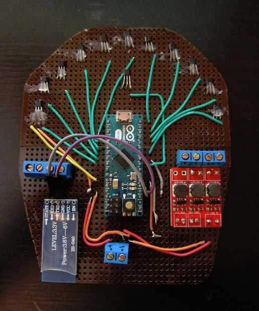 El arco de control utiliza 11 sensores de hall, con otro 1 utilizado para apagar la luz. Estos fueron conectados en los pines A0 -> A5 y 4,6,8,9,10,12. Comparten un común 5v y tierra carril/pin.
