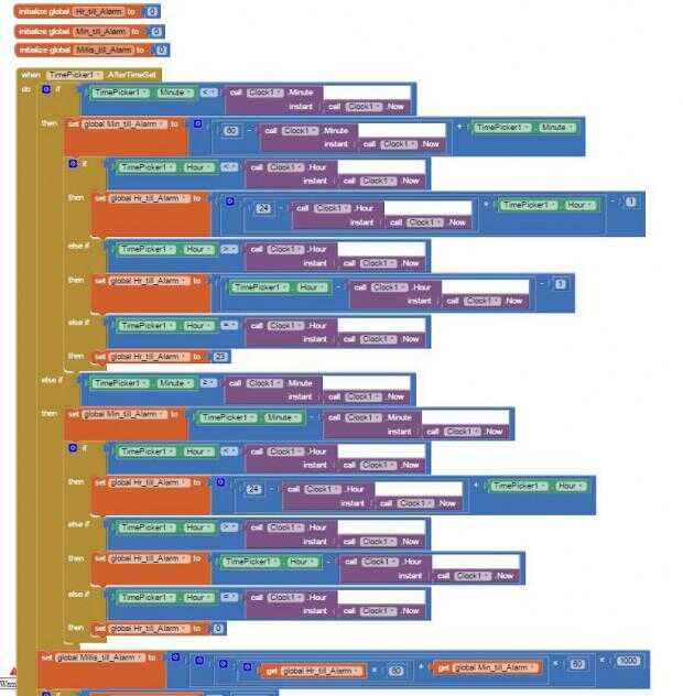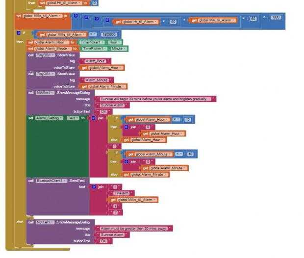 Al pulsarlos o acabado mover el sol trae para arriba el selector de tiempo para que pueda establecer una hora de alarma. La parte principal de este bloque siguiente está utilizando la hora actual para calcular cuántos milisegundos hay hasta ajuste de la alarma. Este valor es entonces enviado a Arduino