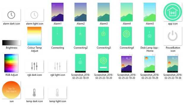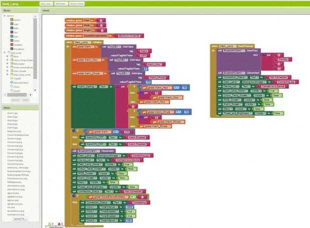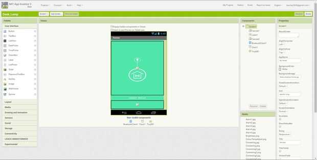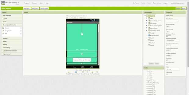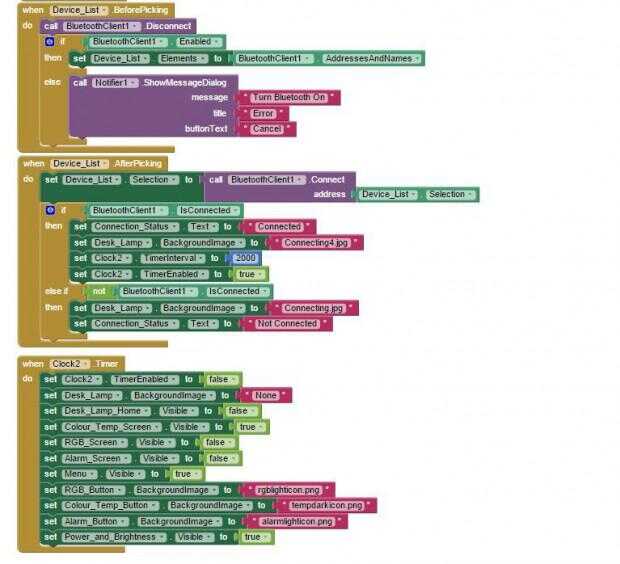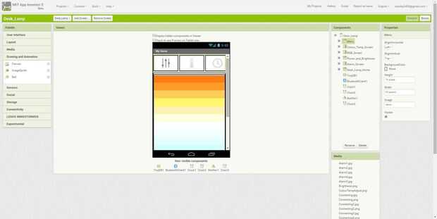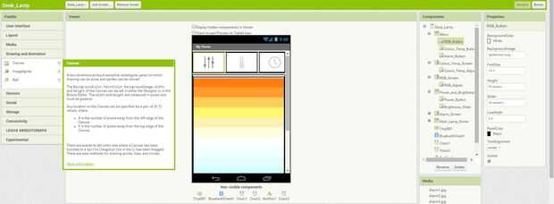 Usando la pestaña 'Diseño' construido por las pantallas de app. Un problema que encontré es que el componente bluetooth no funciona a través de múltiples pantallas, así que después de la pantalla de 'bienvenida' todos los demás (conexión, RGB, color temperatura, la alarma) son todos creado en la misma pantalla - eficazmente capas que encender/apagar.