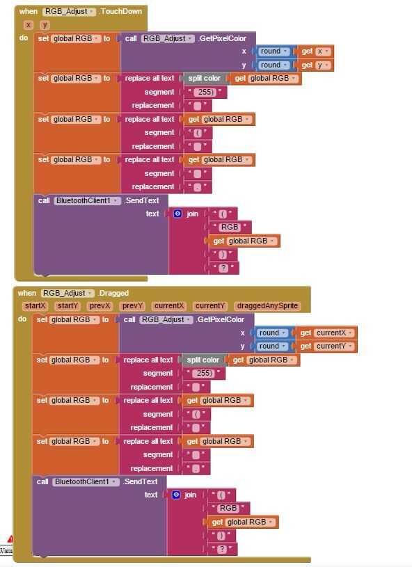 Estos bloques son para el control RGB. Hay un comando llamado 'GetPixelColor' que puede utilizarse para obtener un valor RGB de píxeles que es tocar con los dedos. Salidas el valor con un extra 255 al final por alguna razón, por lo que hacer un poco de trabajo para obtener el valor en el formato (RGBredvalue.greenvalue.bluevalue.)? Otra vez esta es entonces enviada a Arduino, pero con el RGB como un identificador en la cadena.