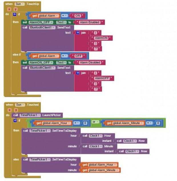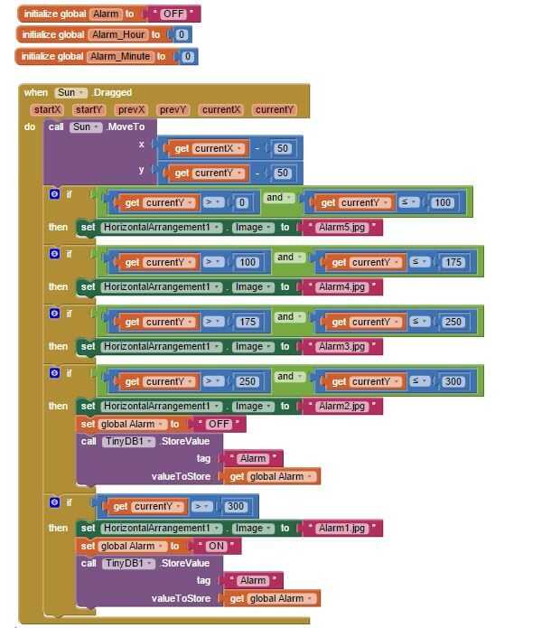 La siguiente sección de bloques es para la configuración de la alarma. El primer bloque controla lo que sucede cuando toque/arrastra el sol hacia arriba y hacia abajo. Una vez más, se utilizan los comandos 'get actual X y Y' para obtener un valor para que el dedo está y cambiar la imagen de fondo dependiendo de la altura del sol. Los suns posición también controladores si la alarma está habilitada o deshabilitada, se trata de enviar por bluetooth.