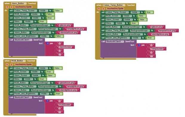 Estos bloques de controlan lo que sucede al tocar cada uno de los botones del menú - cambiar entre RGB, color temp y alarma. Como te tocaron las capas visuales aplicables se encienden y apaga. Es decir cuando usted pulse el botón RGB cambia la imagen de fondo de la lona de botones el icono oscuro, se apaga en la pantalla RGB y el otro.