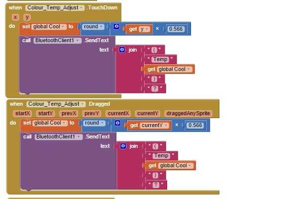 Estos bloques controlan el ajuste de temperatura de color. Al tocar la lona, la coordenada Y de su punto de contacto se utiliza para establecer la variable 'cool'. El valor de Y es conducido por el tamaño de píxel de la lona, en mi caso un valor entre 0 y 450. Yo uso el multiplicador para convertir en un valor útil del PWM (0-255). Luego enviar un string con ese valor y un identificador de la forma (Tempvalue)?.