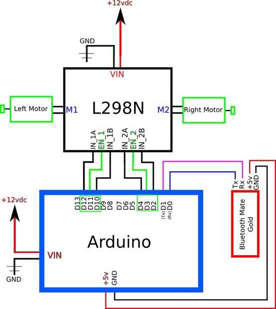 Para obtener un funcionamiento del robot mediante Bluetooth, hay muy pocas conexiones. (3) cables para el control de cada motor de la Arduino a controlador de motor, (2) cables para el adaptador de Bluetooth serial al Arduino, los cables del motor (4) y unos cables. Utiliza pines macho para hacer cables de conexión de la Arduino a la PCB del controlador de motor (ambos utiliza conectores hembra). Si usas el escudo de Sparkfun Ardumoto, no necesita cablear el controlador del motor a la Arduino, sólo el adaptador de Bluetooth y poder.