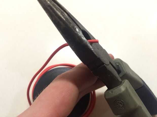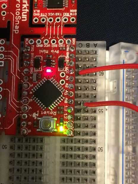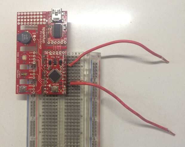 A continuación se que necesita cortar algún cable. Dése una cantidad abundante de longitud para trabajar, para estar seguro. A continuación, tira de los bordes para darte algunos metales expuestos e inserte una de las puntas de su cable de primera en el nicho adyacente a pin 13 en su ProtoSnao. Repita este proceso con un segundo cable, insertar esa punta en el nicho adyacente a la clavija marcada "VCC".