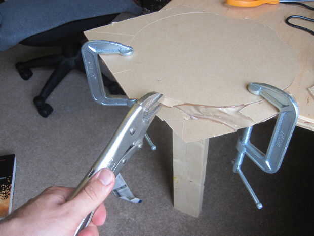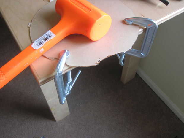 La primera vez que intenté esto, solía las abrazaderas en C el acrílico de la abrazadera en el borde de una mesa y luego golpeó el disidentes pedazos con un martillo. No funcionó y dio lugar a grandes trozos rompiendo dentro del perímetro circular (esto funciona bien para cortes rectos si estás haciendo un espejo rectangular, aunque).