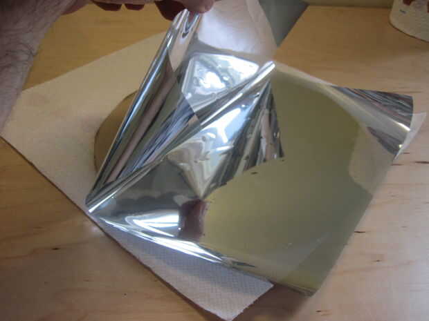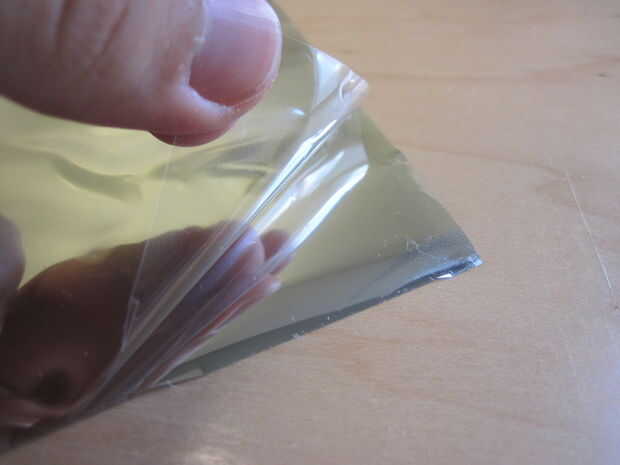 El tinte de la ventana viene con una capa protectora transparente por un lado, que tiene que quitar para dejar al descubierto el adhesivo pegajoso. Comience en una esquina y cuidadosamente use la uña para pelar la capa clara (esto puede ser un dolor para hacer), luego coloque cuidadosamente el tinte de espejo sobre la pieza de acrílico. Creo que esta es la parte más frustrante/difíciles de todo el proyecto - desea obtener el tinte tan plano como sea posible, sin burbujas de aire. Burbujas de aire grandes serán dolorosamente visibles en el espejo final y pueden restar la ilusión. Hice mi mejor esfuerzo para obtener el tinte tan plano como sea posible y "hecha estallar" burbujas de aire empujándolos hacia el borde exterior con mi yema del dedo (usando una toalla de papel para que no roce el tintado). Si usted realmente se arruinara en su primer intento, puede pelar el tintado la mayoría de la manera y tratar de poner abajo plano otra vez, el adhesivo no debe perder su viscosidad. Si todo falla otra cosa que también puede solo corta un trozo nuevo.