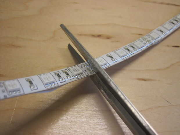 Una vez que hayas conseguido la manera entera alrededor, cortar la tira de LED. Importante: el LED solo no se puede cortar en cualquier lugar - tienes que cortar en los segmentos 3-LED, y puede ver las líneas de corte con soldadura etiquetado cojines. Si se corta en ninguna otra parte, los últimos pocos LEDs de su banda no funcionarán.