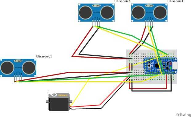 Utilizando el diagrama de arriba, enganchar las piezas. Para referencia, abajo hay una lista de donde van los pernos. En letras pequeñas en el sensor ultrasónico, verá varias etiquetas. Utilizar para identificar qué pines son tensión en (vcc) disparo (trig) Echo (eco) y tierra (gnd).