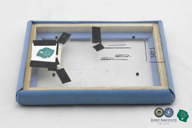 Adhieren a las superficies de las barras de madera de dos 20 cm 10 mm * 20 cm los dos lados más cortos del tablero acrílico grande con pegamento UHU. Adhieren a las superficies de las barras de madera de dos 25 cm 10 mm * 20 cm los dos lados más largos del tablero acrílico grande con pegamento UHU. (Figura 2.7)