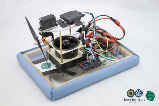 3. fijar la batería en el centro del cuerpo cerca de la torre de energía aerodeslizador con cinta.