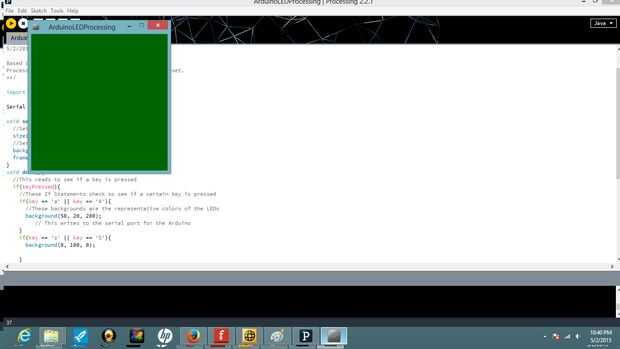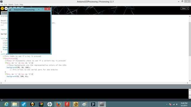 Este programa hace es tomar la entrada de A, S, o R en la computadora da información visual en la computadora en forma de colores de fondo. Después de escribe en un puerto serie a través de la biblioteca de serie para que el Arduino puede leerlo. Una lista de puertos abiertos COM están impresas en la caja negra en la parte inferior del IDE