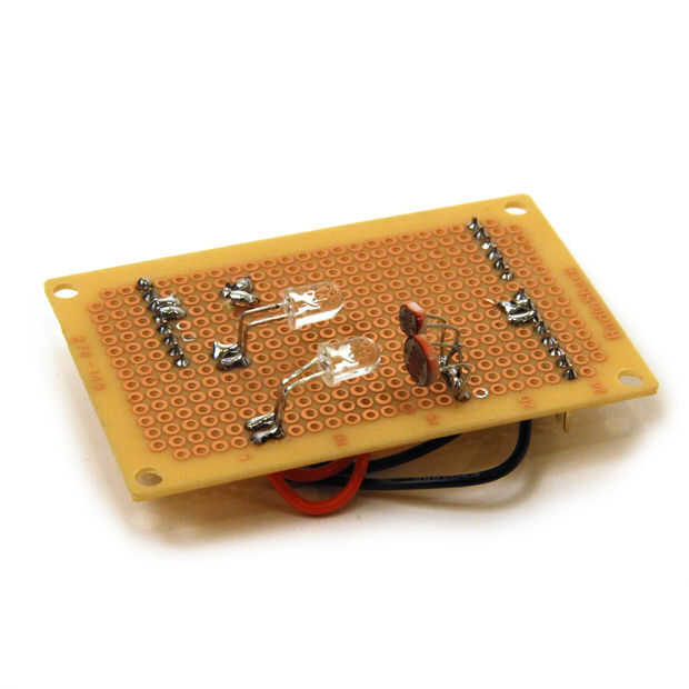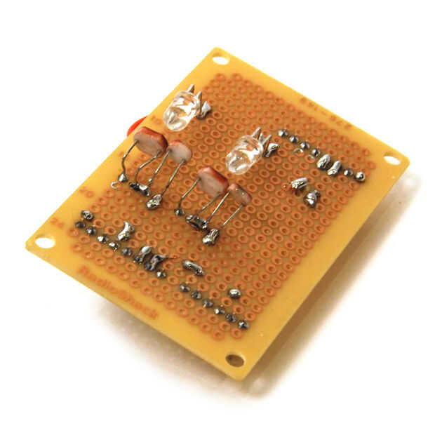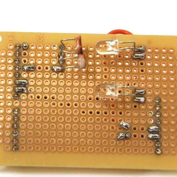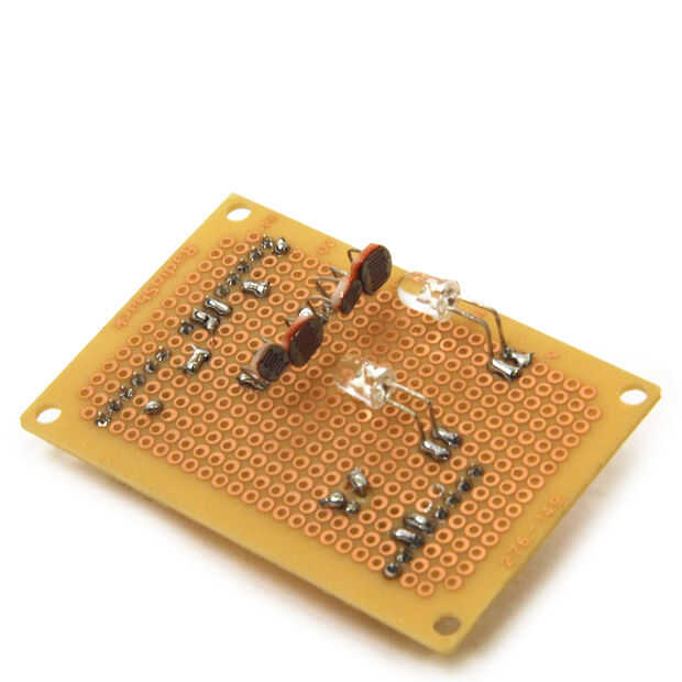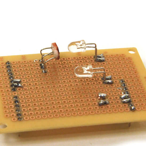 Soldadura de una grande y una fotorresistencia pequeña (de la serie de cinco) en serie en el protoboard (Asegúrese de que están en el mismo lado que los LEDs). Doble los cables de la photoressitros para que apunten directamente a uno de los LEDs. Solde un resistor de 4.7kOhm y 10kOmh en serie con estas dos fotorresistores (fig 4).