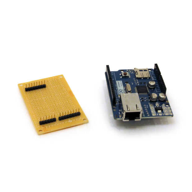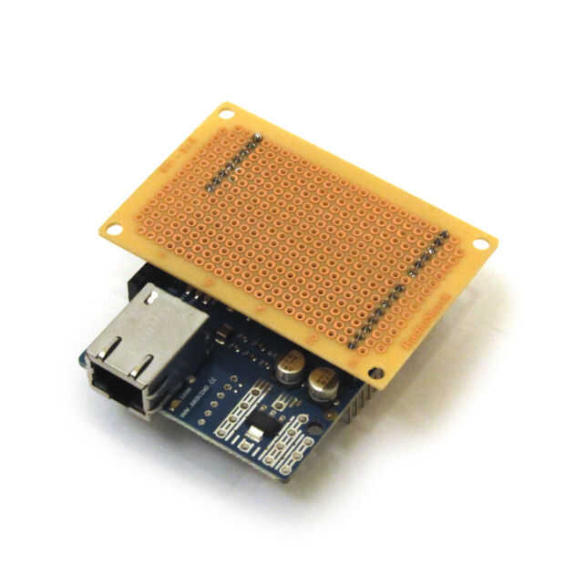 El protoboard albergará el circuito que permite el arduino a interfaz con el alimentador de control pcb. Este tablero se conecte directamente a los pines en el escudo de arduino ethernet. Pernos de encabezado a la protoboard de la soldadura por lo que puede ajustar en el poder, analógico, y digital 0-7 pernos el escudo de arduino ethernet.