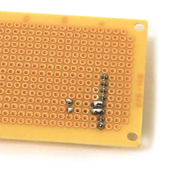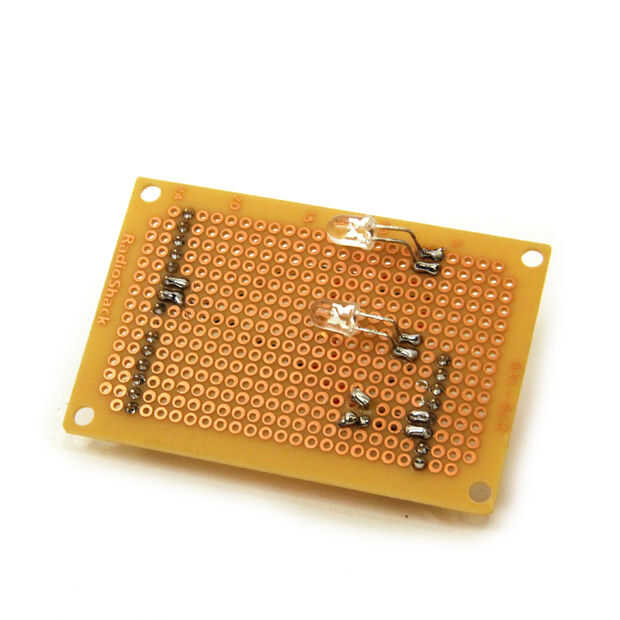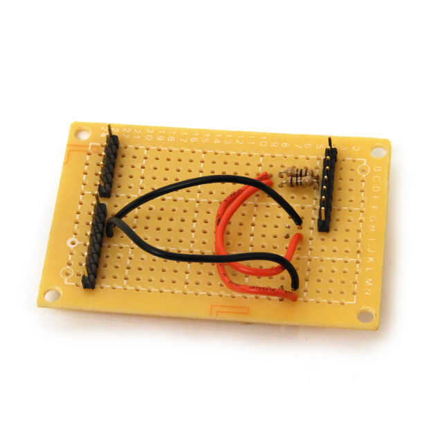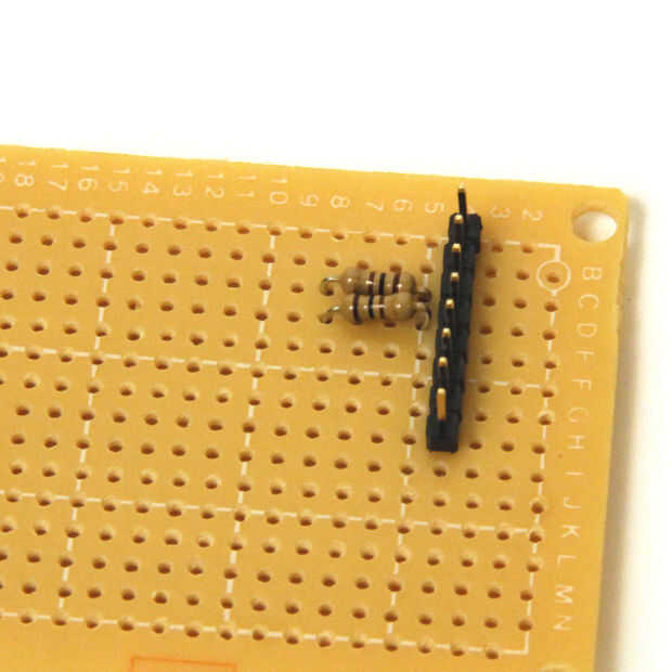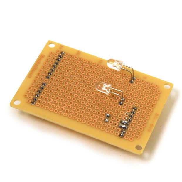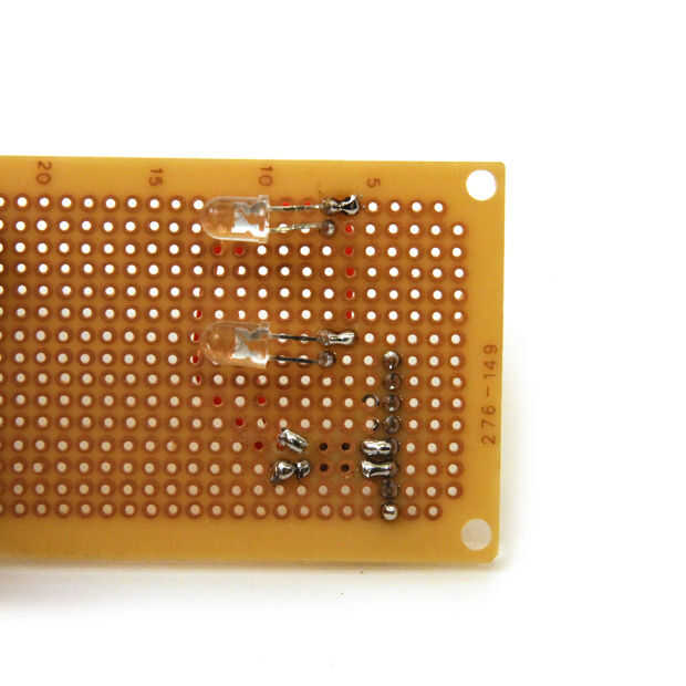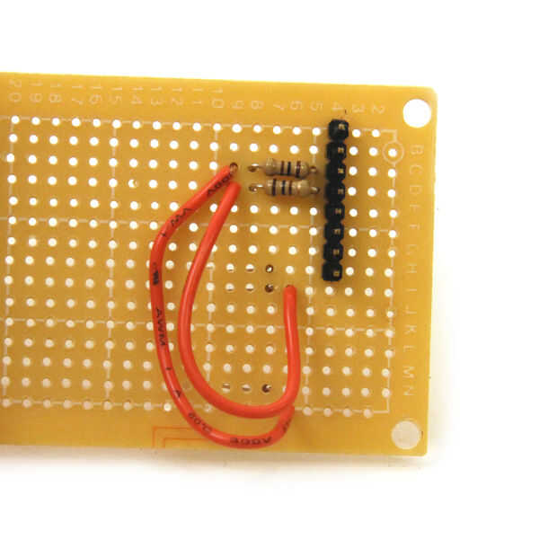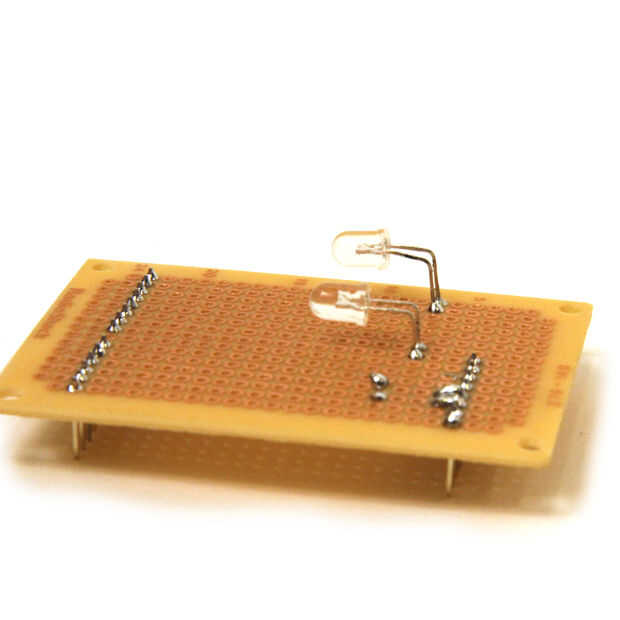 De la soldadura de dos resistencias de 100 ohm a la protoboard.  Una resistencia debe conectarse eléctricamente al pin header para pin digital de arduino 2 y la otra resistencia al pin digital 3 (Figura 2).  Doblar las puntas de dos LEDs blancos y suelde el lado cobre de la protoboard como se muestra en las figuras 3 y 4.  Soldar un cable de puente (rojo) entre cada una de las resistencias de 100 ohm y los ánodos de cada uno de los LEDs blancos (figuras 5 y 6).  Soldar dos cables de puente (negro) entre los cátodos de ambos LEDs y el suelo de arduino (Figura 7 y 8).