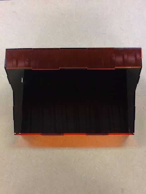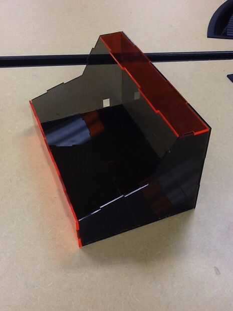 Conecte los lados a la pieza inferior pieza posterior, pieza superior y frontal. En las juntas donde se conectan las piezas, tienes que poner una pequeña cantidad de pegamento caliente en. No necesita mucho. Debería verse como esto hasta este punto.