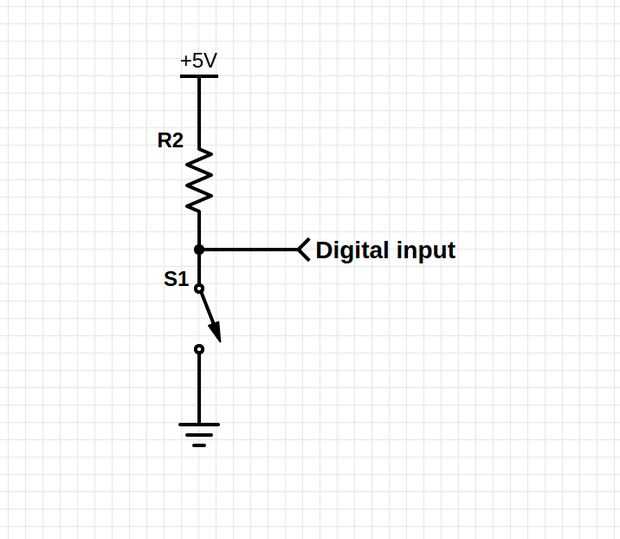 Funciona así: el Arduino tiene un tirón interno hasta resistencia. Cuando el interruptor está abierto, la entrada digital obtiene 5V a través de la resistencia y así un 1 digital. Cuando el interruptor está cerrado, básicamente tiene un divisor de voltaje en R2 es igual a 0, por lo que Vout será 0V, por lo tanto un 0 digital. Sin embargo puede ser un poco contra-intuitivo: pulsador es cero digital y botón liberado es digital.