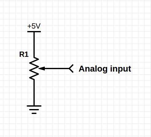 Si usted toma una mirada en el esquema, se pueden ver 2 resistencias. R1 es la resistencia entre el pin derecho del potenciómetro y el limpiador (patilla central) y R2 la resistencia entre el pin izquierdo y el limpiaparabrisas. Ya que nuestro potenciómetro fijo valor (50kΩ en este caso), R1 + R2 siempre será 50kΩ, mientras que R2 puede variar entre 0Ω y 50kΩ. Por lo tanto, la fracción siempre tendrá como resultado un número entre 0 y 1. Multiplica esto por 5V (Vin), y obtendrá una tensión entre 0V y 5V en la salida. Este voltaje puede ser leído por el Arduino ADC (analógico al convertidor digital) y representa la posición del potenciómetro (o fundido).