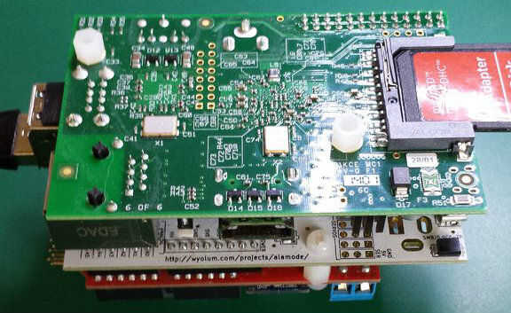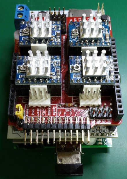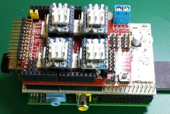 Así que ahora tengo una pila de tres juntas. Con el Pi de frambuesa en el fondo, el Alamode en el medio y el escudo de controlador CNC en la parte superior. Todo conectado juntos. Un problema para mí fue que el Alamode no presenta los orificios de montaje. Proporciona un cojín de goma que va en la parte superior el conector Ethernet RJ-45 en la Raspberry Pi y es la altura correcta (debe ser muy cuidadosamente colocados en el conector RJ-45) pero no hay ningún punto de conexión sólida que no sea el conector GPIO. El escudo de controlador CNC es como más otros escudos Arduino y se mantiene muy bien en el lugar debido a la fricción de los extensores de encabezado en el Arduino. Mi Pi frambuesa original no tenía agujeros en ella. Eso es parte de la razón por qué me decidí a conseguir uno nuevo y utilizarlo en su lugar. Más tarde compré un surtido de separadores de nylon y adjunta un par de ellos a la frambuesa Pi - con un par de arandelas para obtener la altura correcta. Luego con mucho cuidado poner una gota de pegamento en la parte superior de cada uno de los separadores de nylon y poner el Alamode en la Raspberry Pi. Luego la dejé sola un rato. Más tarde fui capaz de tomar los tornillos de la parte inferior de la Pi de frambuesa y sacar el Alamode con separadores a la Alamode - funcionó! Os adjunto también un enfrentamiento entre el Alamode y el escudo de controlador CNC ya que había un agujero en un lugar hizo posible en ambas tarjetas. Así que ahora tengo todas tres juntas firmemente conectados entre sí.