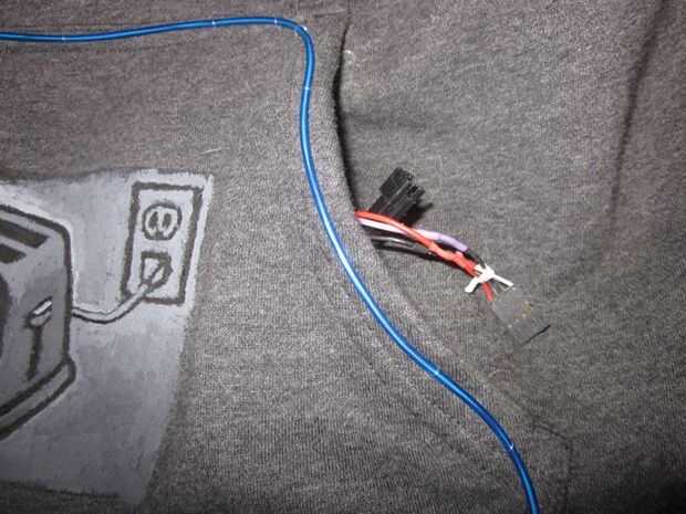 como cortar y soldar el cable aquí. Metido la conexión para el cable en la bolsa de la sudadera con capucha junto con el cable de conexión para el micrófono que se encuentra dentro de la campana (para recoger de primera voz). El recinto se conecta a los cables y se queda en la bolsa. Puedo llegar y tientas para encender el dispositivo, cambiar la sensibilidad audio y promover el elemento de menú seleccionado.