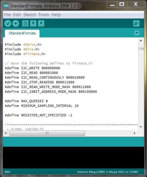 Abra el IDE de Arduino y Arduino Mega del cangrejo controlador a su ordenador utilizando un USB cable A B. Haga clic en archivo -> ejemplos -> una firmado -> StandardFirmata. Esto cargará el código de ejemplo necesario en el IDE de Arduino. Ahora, haga clic en herramientas -> Tabla -> Arduino Mega 2560 o Mega ADK. Esto va a cambiar el tipo de junta para que el IDE sepa qué hardware está trabajando con. Por último, haga clic en herramientas -> Serial Port->(Serial Port Name). Esto ajustará el IDE de Arduino al puerto serie especificado donde está conectado el Arduino Mega (normalmente, el nombre del puerto Serial es algo así COM # para Windows). Cuando todos los ajustes han sido correctamente, subir el código una norma firmado en Arduino haciendo clic en el botón de flecha junto a la marca de verificación en la parte superior izquierda del IDE de Arduino. Si no hay ningún error de naranja evidente en el registro del IDE de Arduino, entonces el código se ha subido correctamente a la placa Arduino.