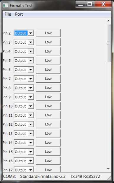 Puede probar el protocolo de una estándar firmado y asegúrese de que funciona mediante la aplicación de la prueba de una firmado. Esto puede descargar aquí: http://firmata.org/wiki/Main_Page. Ejecute el archivo Firmata_Test. Desde aquí, haga clic en Puerto->(Serial Port Name). El nombre del puerto Serial es el mismo que sirve para subir el código en el IDE de Arduino. Después de unos segundos, debería ver una gran cantidad de información de perno aparecen. Se pueden controlar en tiempo real. En particular, estamos interesados en los pines PWM 2 y 3, así como todos los pines de entrada analógicos utilizados para los potenciómetros. Tenga en cuenta que el programa de prueba de una firmado es algo glitchy con Arduino Mega, por lo que tenga que reiniciar un par de veces para obtener los datos del pin analógico completo. Tomar nota de todos los pernos se utiliza y sus gamas, como serán utilizados en el simulador de cangrejo.
