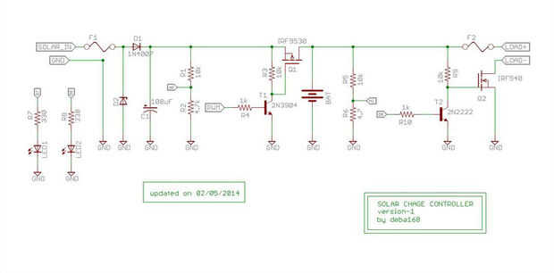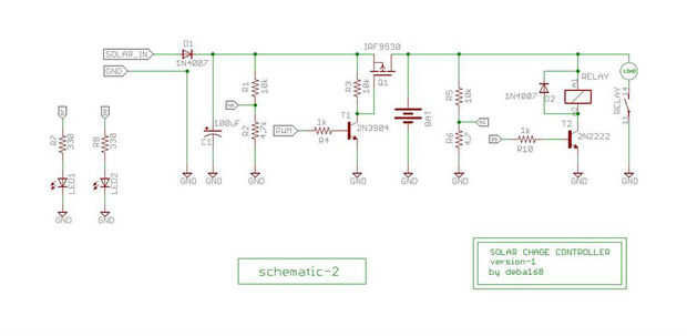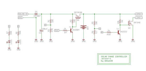 El segundo Mosfet Q2 se utiliza para conducir la carga y segundo transistor que T2 se utiliza para conducir lo Mosfet. Durante la carga de la noche se enciende automáticamente al encender el MosfetQ2 y será eliminado cuando el voltaje de la batería es bajo o días.