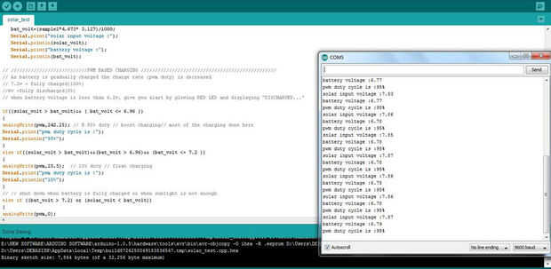 Al principio el controlador de carga se compruebe el voltaje del panel solar y compararla con la tensión de la batería, si es mayor entonces el Arduino comienza a enviar señales de PWM de ancho de pulso a la mosfet(Q1) para cargar la batería. Cuando el voltaje del panel solar fue inferior a la tensión de la batería, este pwm no enviará señales de Arduino.