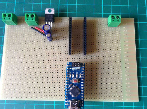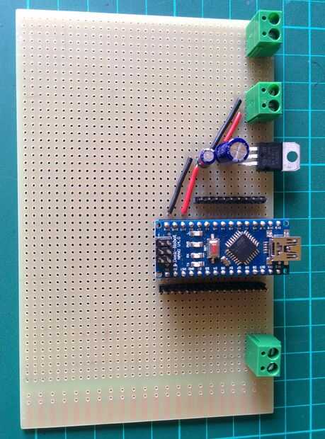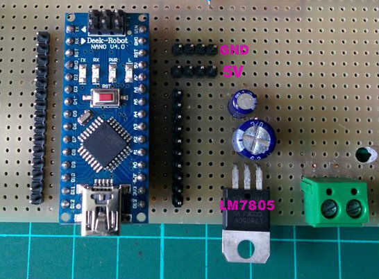 Como se puede ver que conectado el regulador de voltaje de 5V y GND a la nano 5V y GND por cables rojo y negro. Más tarde quitaron y soldadas en la parte posterior para mejor apariencia de la Junta.