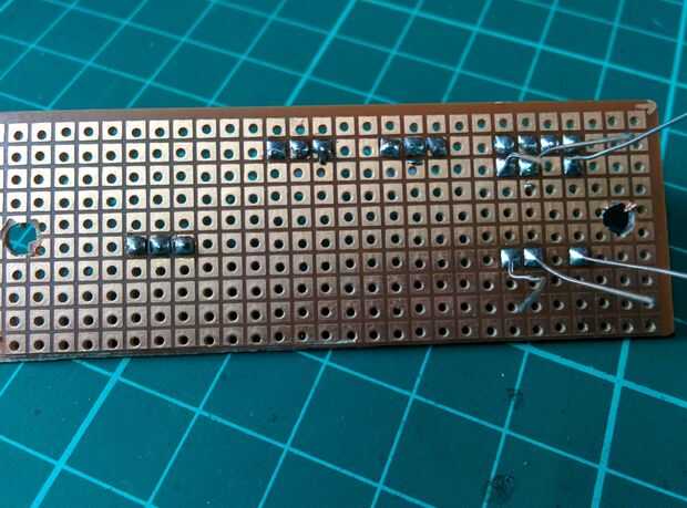 Preparar placa perforada de tamaño pequeño como se muestra. Haga dos agujeros (3,5 mm) con un taladro a izquierda y derecha (para el montaje).