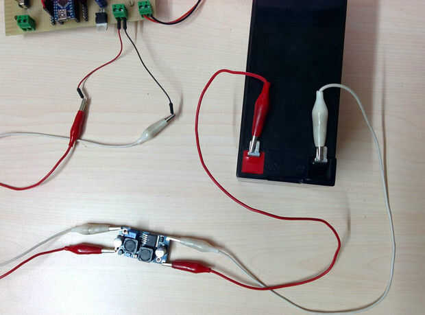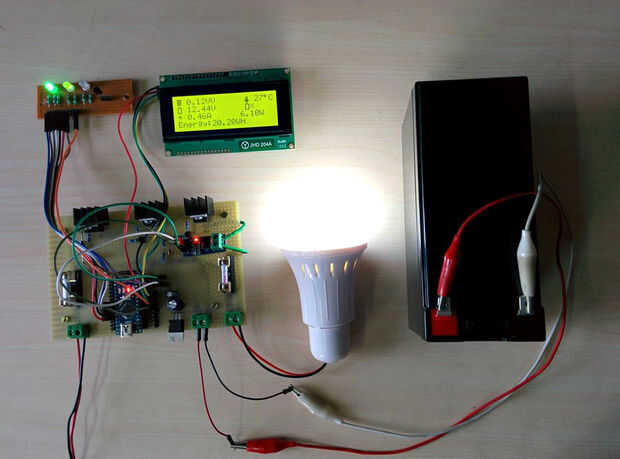 Usé un convertidor buck y tela negra para probar el controlador. Los terminales de entrada del convertidor están conectados a la batería y la salida es conectada a la terminal de la batería de regulador de carga.