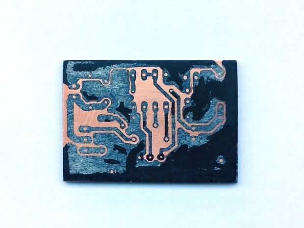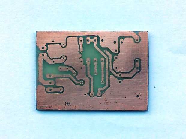 Una imagen del PCB con el toner transferido y retocadas DVD resistente al marcador se muestra en la fotografía.