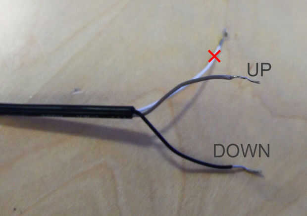 Al desmontar el controlador de botón en la mesa de altura ajustable usted encontrará tres cables. Dos son para arriba y abajo y el tercero es la señal de disparo. Traer los cables juntos uno por uno a la figura hacia fuera cuál es cual. Puesto que vamos a usar el Arduino para generar la señal de disparo sólo necesitamos hasta y hacia abajo de los cables