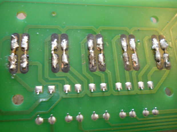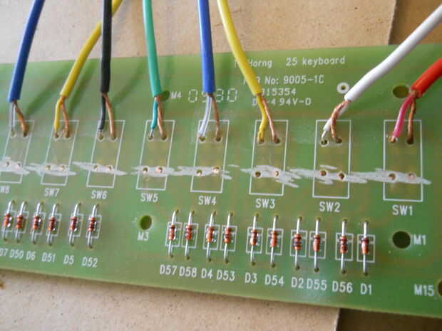 He perforado a través de las almohadillas de rayados en el circuito, asomó un poco de alambre, atrás en el agujero junto a él, luego le da un punto de soldadura. Luego tienes cortado el exceso con una Dremel. Fue un poco crudo, pero hizo el trabajo y no va a ceder si consiguió golpeó sobre. Necesitaba todos 25 teclas para trabajar así que tomo mi tiempo y no intentó nada naufragio!