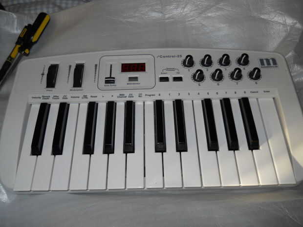 Tenía 25 teclas para poder cambiar con botones, un montón de diales rotatorios, fue alimentado por bus USB y un pedal de entrada. La entrada de footswitch significó sólo pude conectar vía gato y cualquier cosa con un interruptor de convertirse en un disparador de MIDI!