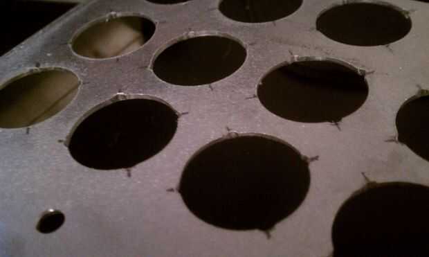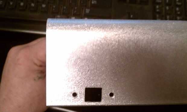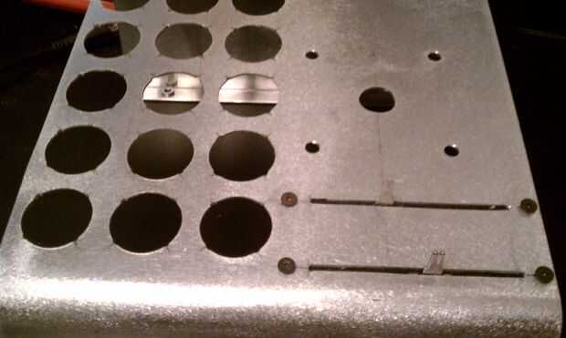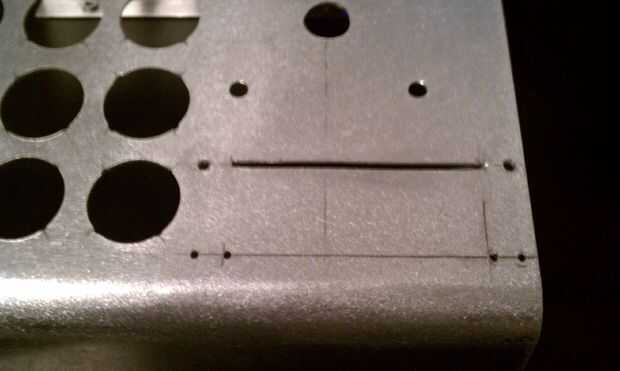 Taladre los orificios de montaje de la palanca de mando fue bastante sencilla. Las ranuras para las macetas se marcaron hacia fuera y los agujeros pequeños perforaron en cada extremo. Un pequeño disco en la Dremel conecta los puntos.