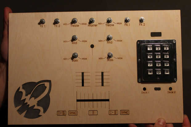 Utilizamos la madera para la base y el panel frontal de la caja. Se utilizó el plexi de los lados (para que todo el mundo pueda ver la electrónica fría dentro!), para llenar el espacio negativo del logotipo rocketship en la parte delantera y también para llenar el selector de la cubierta LED.