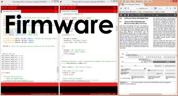 Como se indicó anteriormente, este proyecto tiene dos diferentes microcontroladores que manejan diferentes controles en el circuito. El microcontrolador principal es responsable de leer entrada de 6 de los controles analógicos, leyendo los 5 botones, interpretando el codificador rotatorio y su botón de empuje integrado y pasando datos seriales de microcontrolador secundario a la computadora. El microcontrolador secundario es responsable de la comunicación SPI con el convertidor de analógico a Digital de MCP3008 e interpretación de la entrada del circuito de teclado (que consiste en el teclado, el interruptor de la cubierta y el selector de modo). Estos ICs trabajan mano a mano para darnos una gran variedad de controles!