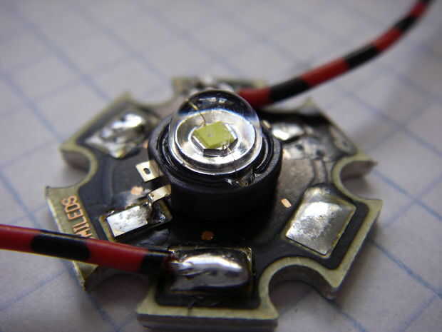 La imagen muestra el conductor actual constante conectado a un LED Luxeon de 1W blancos.