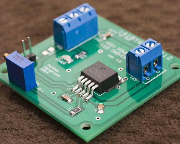 Estos controladores de LED se basan en el controlador de LED CAT4101 de a Semiconductor. Puede manejar hasta 25V y 1A, por lo que son perfectos para muchos LEDs de alta potencia. Los LEDs de 3W que he comprado fuera de eBay tienen una tensión de 3.4 a 3.8V y un máximo. corriente de 700mA. De acuerdo con estas especificaciones, uno de estos controladores puede alimentar hasta 6 LEDs!