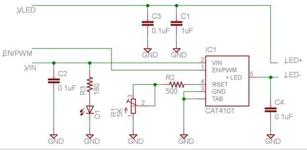 En mi diseño, utilicé un resistor fijo de 510 ohmios en serie con un potenciómetro de ajuste de 5K. El trimpot me permite marcar en un LED específico actual de < 100mA a poco más de 1A. El resistor fijo protege contra accidentalmente ajuste cero ohmios en el trimpot y potencialmente destruir su LED y la CAT4101. El método preferido es establecer el LED máximo actual que desea (y que el LED puede manejar indefinidamente) y luego Olvídalo! Regulación debe hacerse entonces mediante PWM/at.