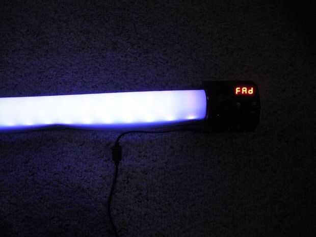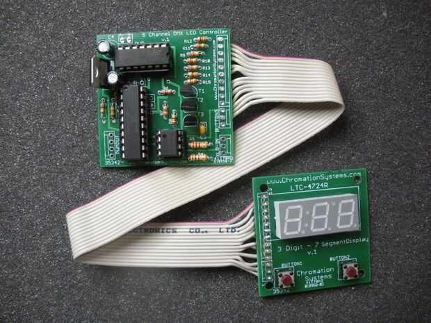 Un compacto, fácil de montar, controlador de LED salidas que TTL PWM señales de rojo, verde y azul LED. El PWM señales de control de conductores del LED (salida juntas, Reglamento basado en MOSFET/Resistor o reguladores de corriente constante), que son seleccionados basado en la configuración (corriente, voltaje, tipo) del LED ser controlados. 2 botones, pantalla LED de 7 segmentos y 3 dígitos son en un PCB separado conectado con un cable de cinta, por lo que se puede montar en cualquier lugar. La pantalla muestra al usuario la dirección actual o lo que se establece el modo actual de independiente en. Los 2 botones se utilizan para configurar la dirección DMX (arriba/abajo) y para el control independiente para cuando no se utiliza la entrada DMX. El usuario puede seleccionar el tiempo en el dispositivo utiliza 3 o 5 canales de DMX datos. El dispositivo puede ajustarse para entrar en diferentes modos de solo si pierde señal DMX o no DMX está siendo utilizado. Todas las preferencias de usuario ha cambiado se guardan en el dispositivo y la carga en el inicio hacia arriba.